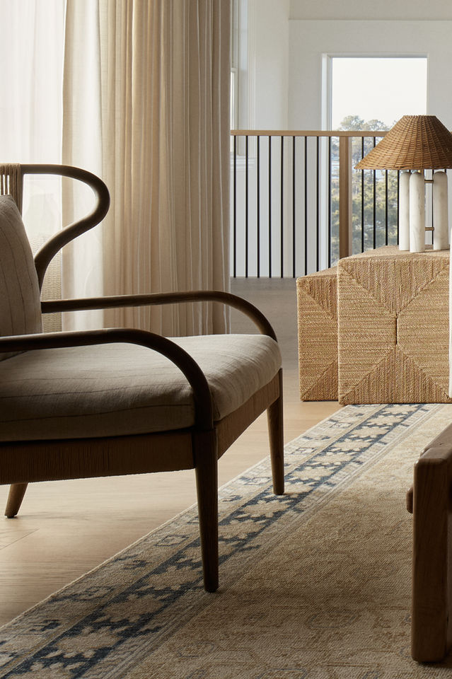 This sculptural take on the traditional wingback chair pairs an organically curved silhouette with layered natural textures. A woven back panel frames subtly striped linen-cotton upholstery, while a knotted rope detail anchors the seat cushion—blending utility with a relaxed, lived-in feel.